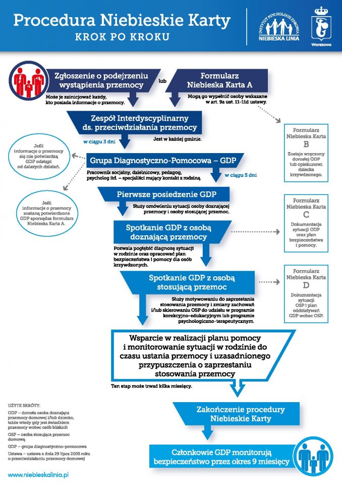 - w związku z powzięciem informacji o stosowaniu przemocy domowej (w szczególności w wyniku zgłoszenia przez osobę doznającą przemocy domowej, kuratora sądowego lub pracownika jednostki organizacyjnej pomocy społecznej, w związku z wykonywaniem ustawowych obowiązków).